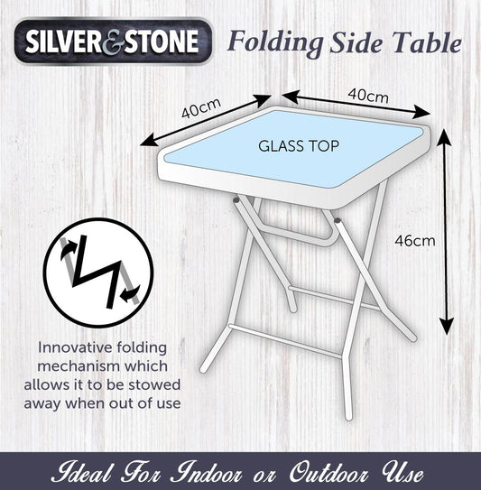 Silver & Stone Folding Side Table with Glass Top 40cm x 40cm x 46cm