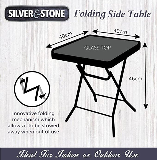 Silver & Stone Folding Glass Side Table 40 x 40 x 46cm - Black - Indoor or Outdoor